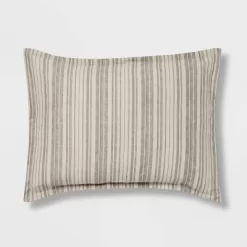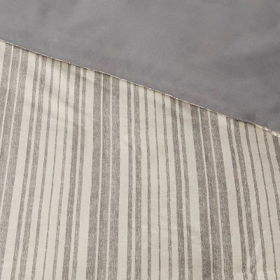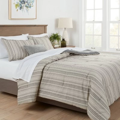 The Rangeley Stripe Comforter Set with Sheets from Threshold™ brings timeless elegance and style that will adapt easily to any bedroom decor. This comforter set includes a soft comforter decorated with a distressed striped pattern in gray over a cream background for a touch of refinement. Also included is a matching pillow sham to create a chic, cohesive look, along with crisp white flat and fitted sheets and a pillow case. Made from a soft and lightweight fabric, this comforter bedding set brings you year-round comfort, while its machine-washable design makes for easy care.