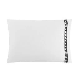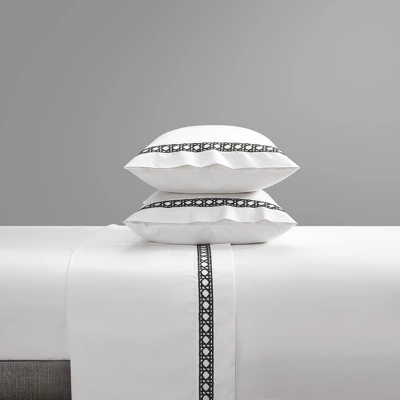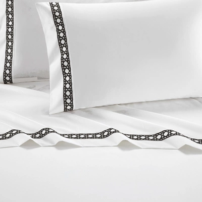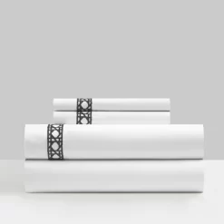 Transform your sleeping experience with the aria sheet set. Crafted from a luxurious cotton blend with a high thread count of 1500 this bedding set delivers exceptional comfort and style. The solid white sheets feature a bold dual stripe embroidery design in elegant black with intricate lattice stitching details that exude sophistication. The set includes a fitted sheet, a flat sheet, and two pillowcases all thoughtfully coordinated to create a harmonious and stylish look. The Chic Home aria sheet set provides a sumptuous and soft feel that will make you look forward to slipping into bed every night. Whether you’re looking to unwind after a long day or simply relax in style the Aria sheet set is the perfect way to elevate your bedding game. Sheet set color: White. Stripe embroidery color: Black.