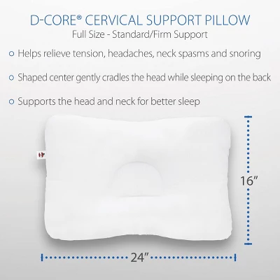 The D-Core Cervical Support Pillow helps relieve tension, headaches, and neck spasms by providing proper alignment of the neck while sleeping and is commonly used to help treat a variety of conditions affecting the neck and shoulders.