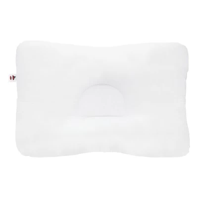 For back sleeping, a very firm cervical roll supports the neck while the D-shaped center gently cradles head for better sleep. The raised side areas for side sleeping help keep the head level for proper alignment of the spine.