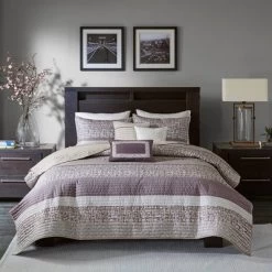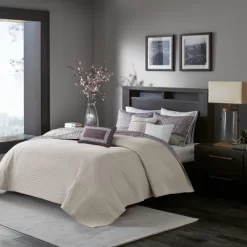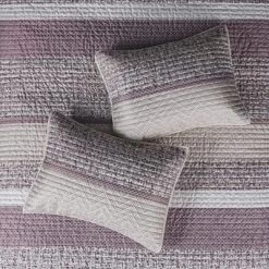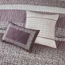 Give your bedroom a new luxurious look with the Harmony 6 Piece Reversible Jacquard Coverlet Set. This reversible coverlet features a stripe design of several different motifs on the face with a solid reverse, for a chic transitional look. The 2 matching shams complement the design of the coverlet to complete this glam comforter set. Also included are 3 decorative pillows with embroidery and pleated details that provide the finishing touches. Machine washable for easy care, this jacquard coverlet set brings a sophisticated update to your bedroom that’s perfect for summer use or as an extra layer of warmth in the winter.