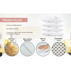 This cover is extra soft and designed for those who suffer from allergies or have sensitive skin. On the reverse side, a panel of soothing cooling gel held beneath a soft mesh helps dissipate body heat, keeping you cool so you can sleep better and wake up refreshed. A mindful design memory foam pillow provides ample support to the whole body, helping cushion common pressure points such as the knees, hip, or back. The shredded memory foam filling is more flexible than traditional memory foam, allowing it to mold to a wide variety of sleeping positions. Great for normal sleep or added support for all side and stomach sleepers, as well as pregnant women! Spot clean and air dry only. Each pillow comes vacuum sealed and rolled flat; Let the pillow air out for 12 hours, then remove the cover and run the pillow through the dryer for 20 to 30 minutes on no heat for maximum fluff.