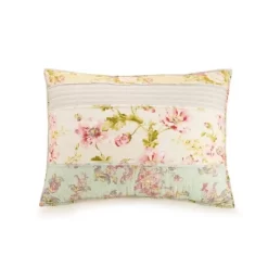Add a romantic English garden ambience to your bedroom with this new quilt design from Jessica Simpson. The pretty, pieced shams are a mix of lovely, vintage, wallpaper floral prints. The design has horizontal piecing and frayed edges where each print meets that create an added tactile accent. The distressed florals in pastel shades are mixed with a textured ticking stripe in an unexpected combination of white stripes on a textured gray ground. This fresh spin on a timeless look is the perfect way to create your beautiful bedroom.