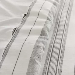 The Monroe Stripe Duvet Cover Set by Levtex Home is a timeless classic. Offered in grey, charcoal and white, this design will immediately transform your bedroom. Made with a durable cotton, this duvet cover set features a a classicly simple barcode striped pattern in charcoal, soft grey, and white. It has a grey, charcoal and white on the front and a 100% cotton on the reverse. It closes with easy to use, durable buttons. The Monroe Stripe Duvet Cover Set is machine washable and includes the duvet and pillow shams. Enjoy this for years to come!