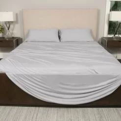 Say goodbye to traditional cotton and transform your nighttime sleep experience with the SHEEX Polar Max Sheet Set. This sheet set changes the way you sleep and will leave you fully refreshed.SHEEX sheets stretch and conform to your mattress, achieving an exceptional fit. With a luxurious drape and sheen, they’re built to withstand annoying wrinkles. Actively wick moisture away to keep you and your mattress cozy and dry. These sheets maintain a consistent temperature so you can stay cool all night long without worrying about sweating. The sheet’s fabric is constructed with an 88-percent polyester and 12-percent spandex content, guaranteeing a soft and comfortable feel. The deep pocket design and stay-fit corners adjust to even the thickest mattresses, so you don’t have to fret over fit. This set includes 2 pillowcases, 1 fitted sheet, and 1 flat sheet, everything you need to turn your bed into a cozy paradise.Put an end to over-heating and other sleep-disrupting temperature fluctuations and start getting the great night’s sleep your body needs to perform at its peak with the SHEEX Polar Max Sheet .