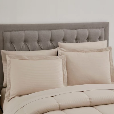 Spruce up your bedroom with our 8 piece hotel style dobby stripe embossed down alternative microfiber bed in a bag comforter, sheet, bedskirt, pillowcase, sham set. The classic baffle-box design with double-needle stitching prevents Blanket filling from shifting and bunching. Set includes comforter, bedskirt, fitted sheet, flat sheet, 2 pillow cases, 2 pillow shams.
